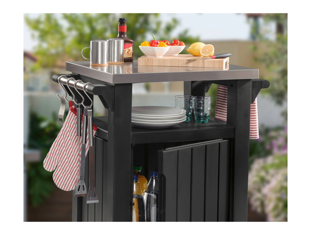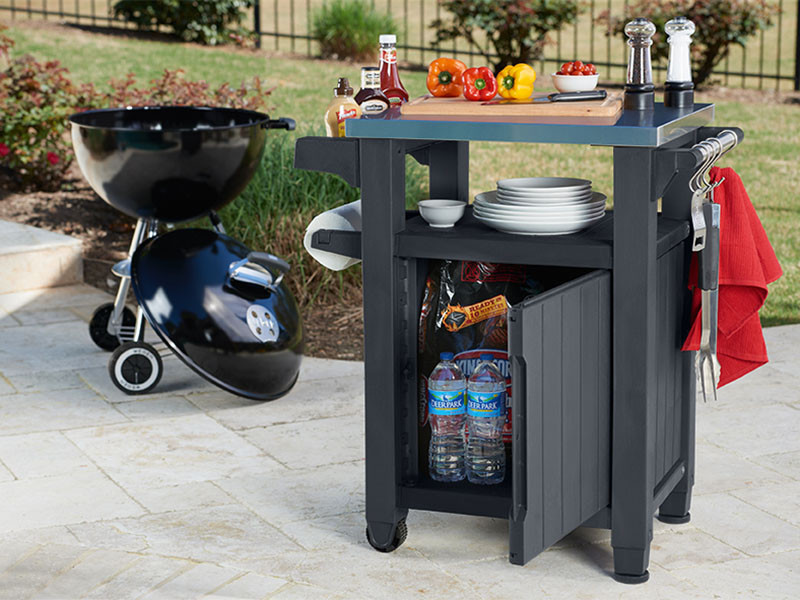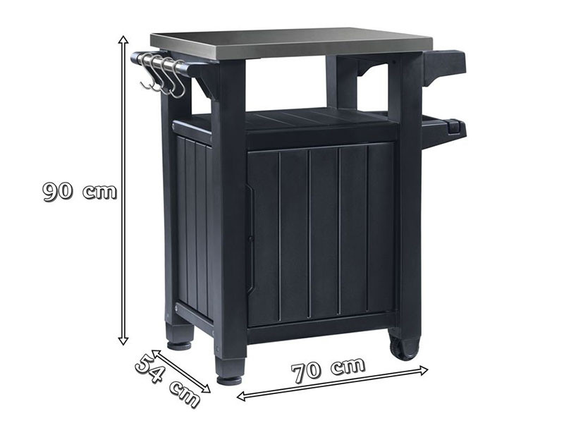 A funkcionális és ötletes megoldásokkal ellátott, gyönyörű stílusú UNITY 93 L grill asztal minden kertben vagy otthoni teraszon beválik. A termék fő előnye a multifunkciós kialakítás. Az átgondolt szerkezetéből kifolyólag a termék ételek előkészítésére szolgáló asztalként, valamint különböző termékek és összetevők tárolására szolgáló szekrényként is felhasználható. Az Entertainment Storage rozsdamentes acélból készült asztallappal, akasztókkal felszerelt kézreálló fogantyúval és kerekekkel rendelkezik, amely rendkívül egyszerűvé teszi a termék mozgatását. A tágas szekrényben kényelmesen elférnek az étel friss levegőn történő tárolásához és felszolgálásához szükséges kézi tartozékok. Egyszerű összeszerelés.