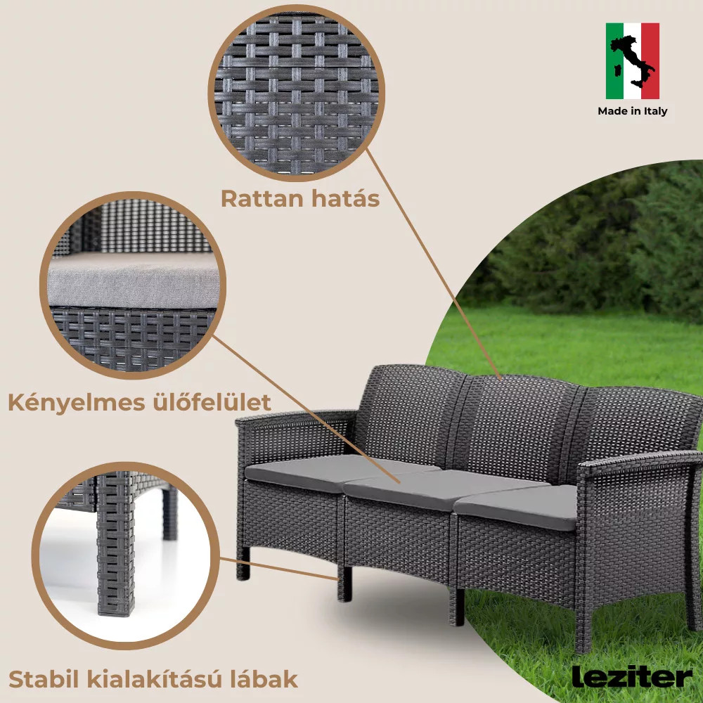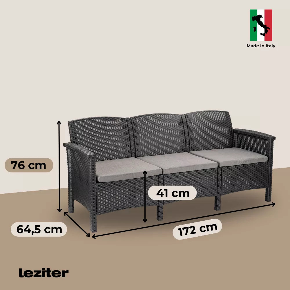 A Venus három személyes kerti kanapét párnával kompletten kínáljuk. Ez a nagy 64,5x 76 x 172 cm-es, kényelmes kanapé bármilyen környezetben tökéletesen mutat, a grafit szín és az eredeti, rattanra emlékeztető felület számos lakberendezési stílushoz illeszthető. A bútor az UV sugárzásnak és az időjárás viszontagságainak ellenálló műanyagból készült ezért időtálló, hosszútávú választás. A tisztítása is rendkívül egyszerű, az összeszerelése pedig még annál is könnyebb.