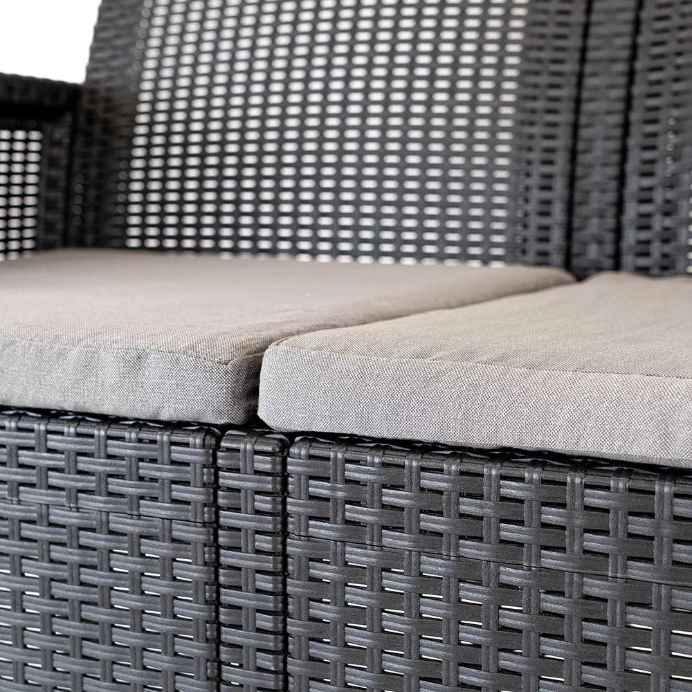 Ez egy kivételesen elegáns és kényelmes kerti kanapé, amely kompletten három párnákkal érkezik. A grafit színű bútorhoz néhány árnyalattal világosabb párnák tartoznak, melyek semleges színe minden térbe jól illeszthető és dekorpárnákkal egyedi stílusra alakíthatók.