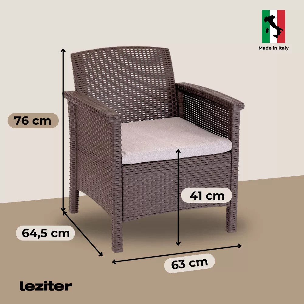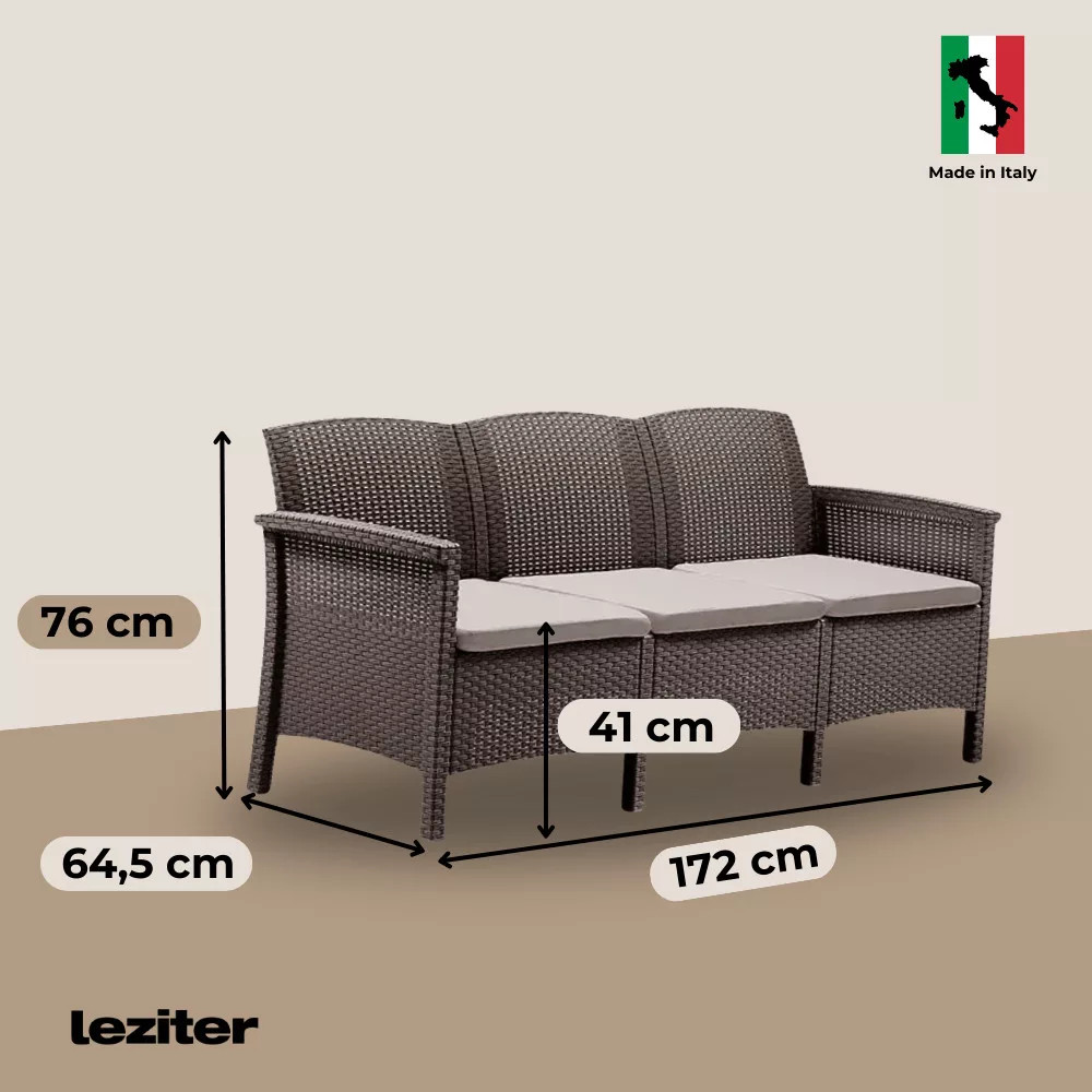 Megjelenés: A bútort esztétikussá teszi az eredeti rattanra emlékeztető felület, valamint a fotelek és a kanapé kényelmes ülőrészei. A bútor szett ideálisan beleillik minden ház körüli térbe és kényelmes lehetőséget teremt a szabad levegőn való pihenéshez.
