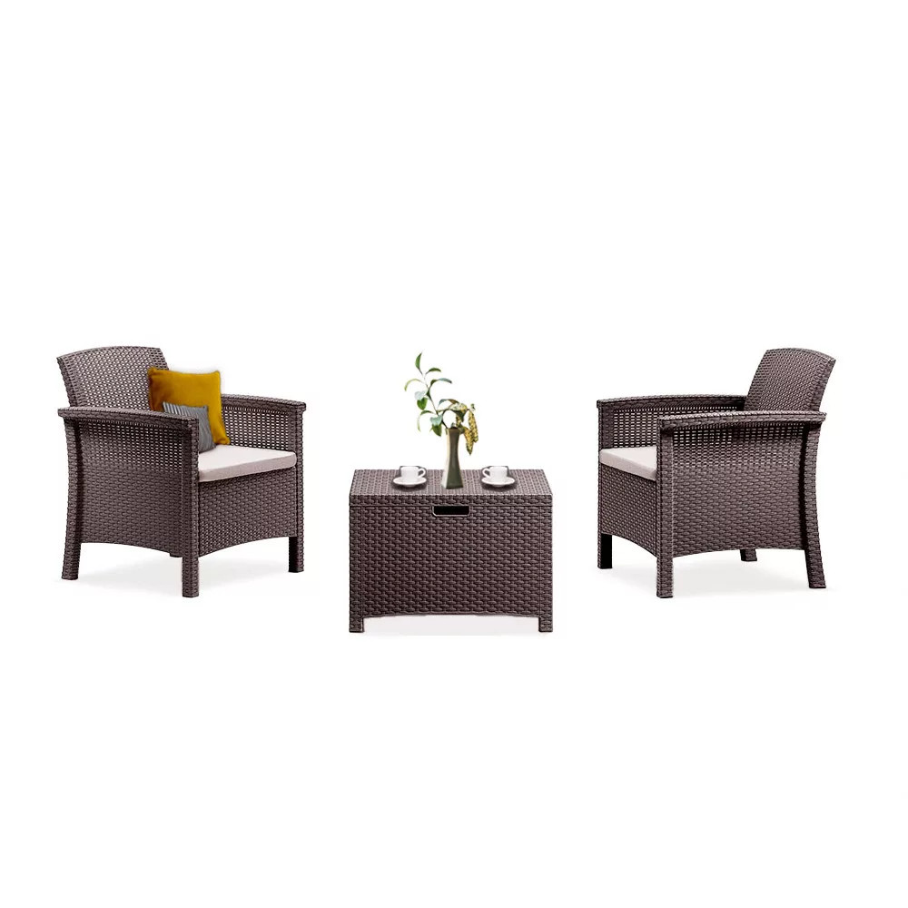 A barna színű rattan hatású kerti bútor szett két darab 63 x 64,5 x 76 cm-es fotelből és egy 60 x 54,5 x 40,5 cm-es négyszögletű asztalból áll. Ez egy kiváló minőségű termék, amely időjárásálló műanyagból készült, nem kellé aggódnia, hogy "megeszi az UV".
