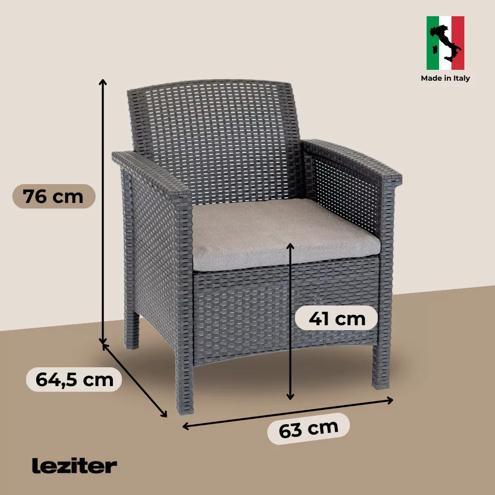 A szék méretei 63 x 64,5 x 76 cm-esek, ami egy kényelmes, közepes méretű szék, így ideális az olvasáshoz, vagy a szabadban való pihenéshez. Könnyen tisztítható, elegáns, mégis tartós és stabil, így biztonságosan használhatja. Az ülőpárna tartozéka a széknek. A párna színén nem látszódik a szennyeződés, pár árnyalattal etér a szék színétől.Kényelem: A kényelmes ülőfelületek hosszú maradásra össztönzik a bútor használóit, ezért ideális választás, ha szeretünk hosszú nyári estéken a szabadban időzni.