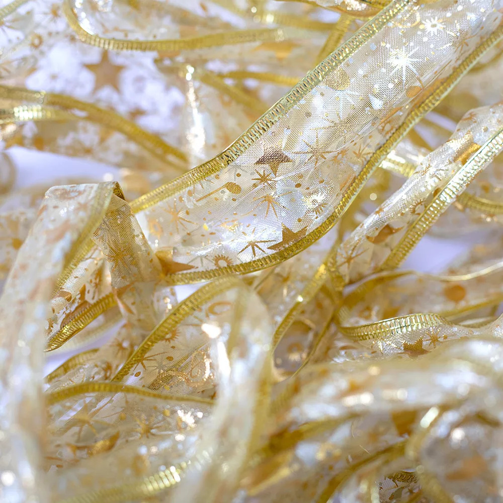 Az arany szalag fényes felülete gyönyörűen visszaveri a LED-ek ragyogását, különösen ünnepi környezetben, így igazán látványos és elegáns hatást kelt. Az átlátszó vezetéknek köszönhetően a fények és a szalag szépsége érvényesül, anélkül hogy a vezeték zavarná az összképet.